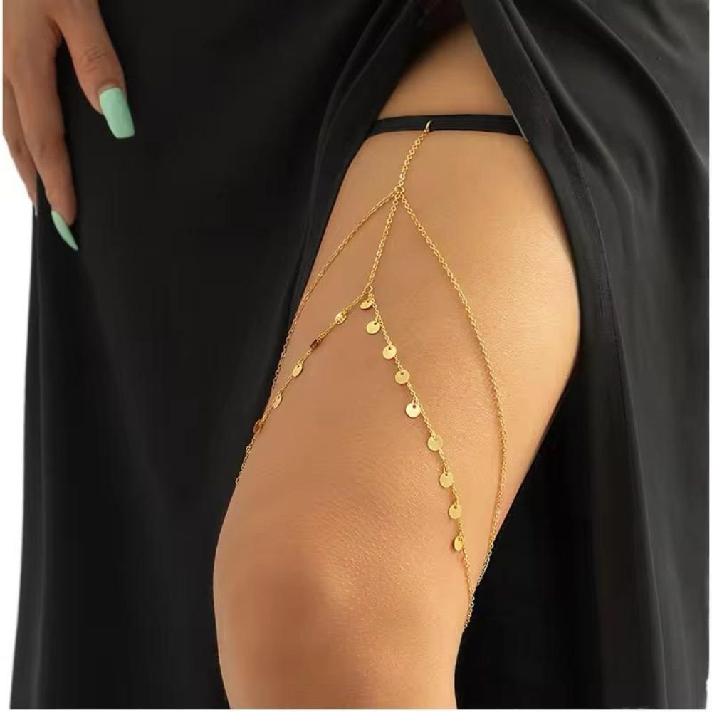 سوار ساق معدني مزخرف بسلاسل فضية صغيرة، يلتف حول الفخذ ليضيف لمسة أنثوية أنيقة. يتميز بتصميم عصري مع تفاصيل لامعة