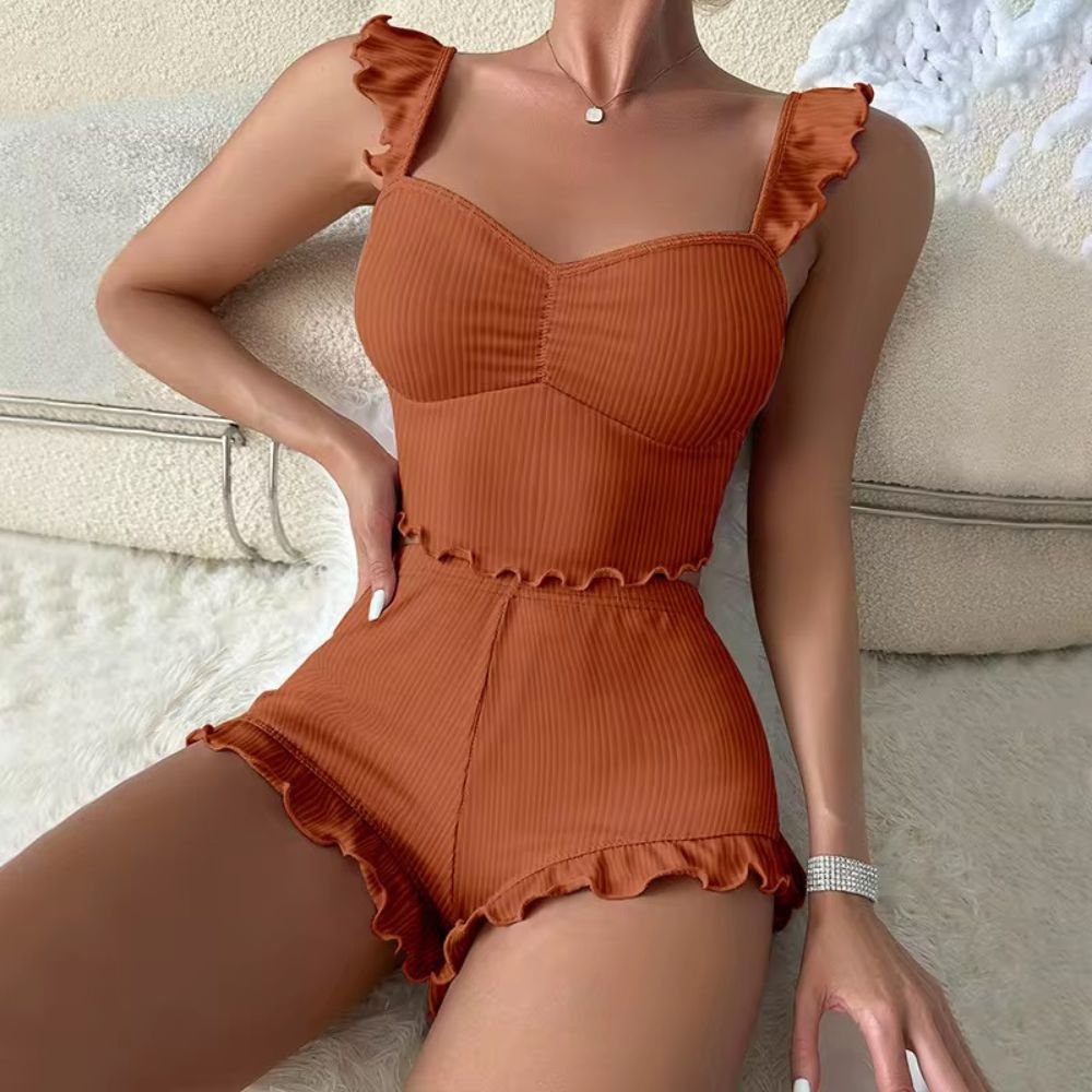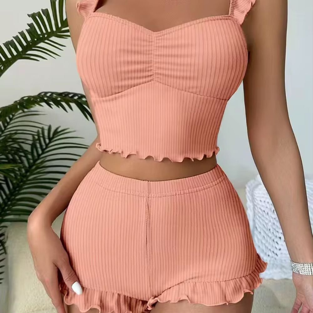 توب بحمّالات مزينة بكشكش خفيف مع قصّة جذابة، وشورت مريح بحواف مموجة تضيف لمسة دلع مميزة