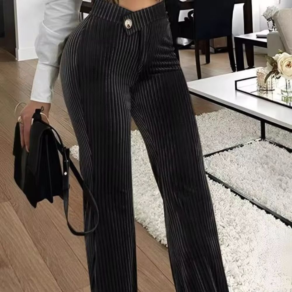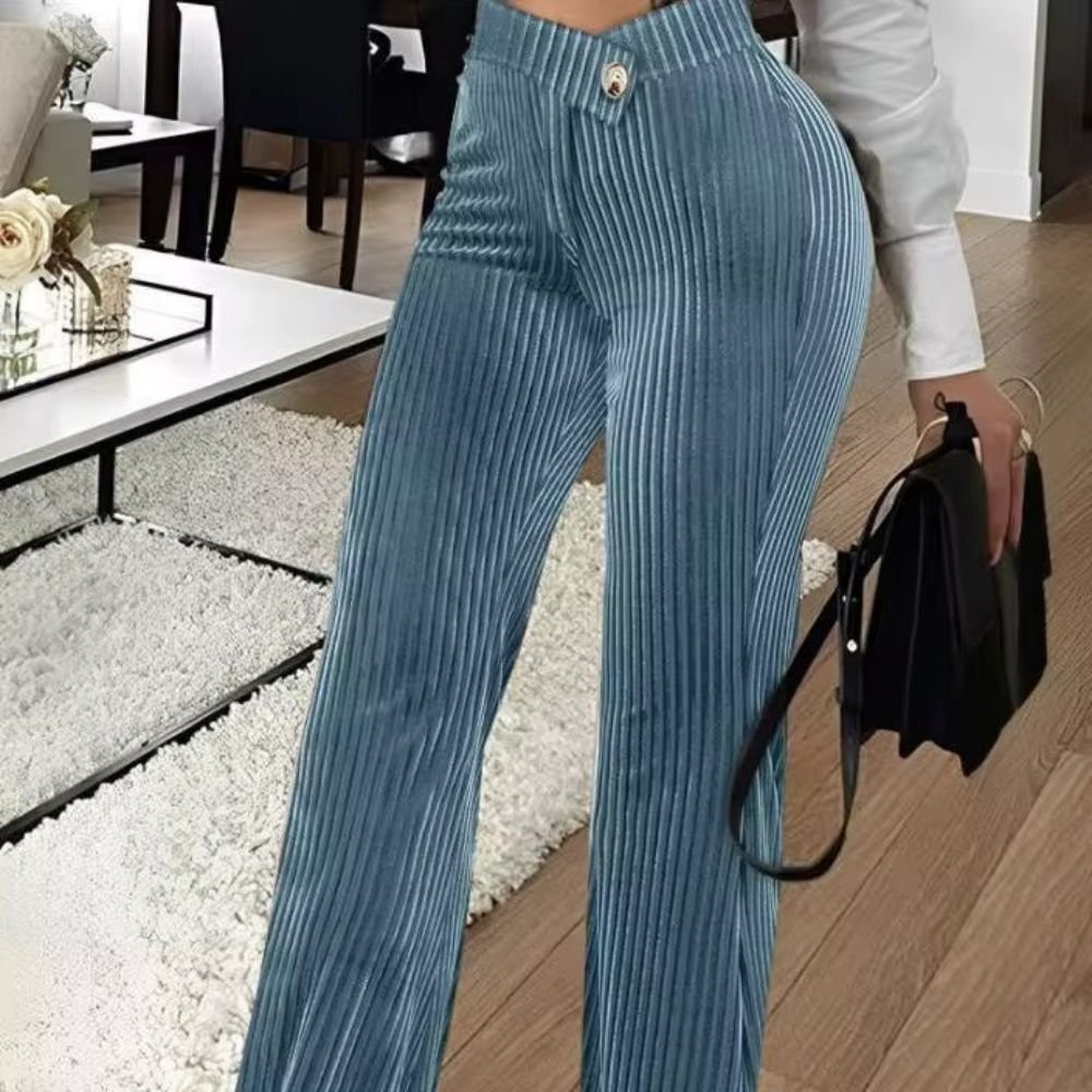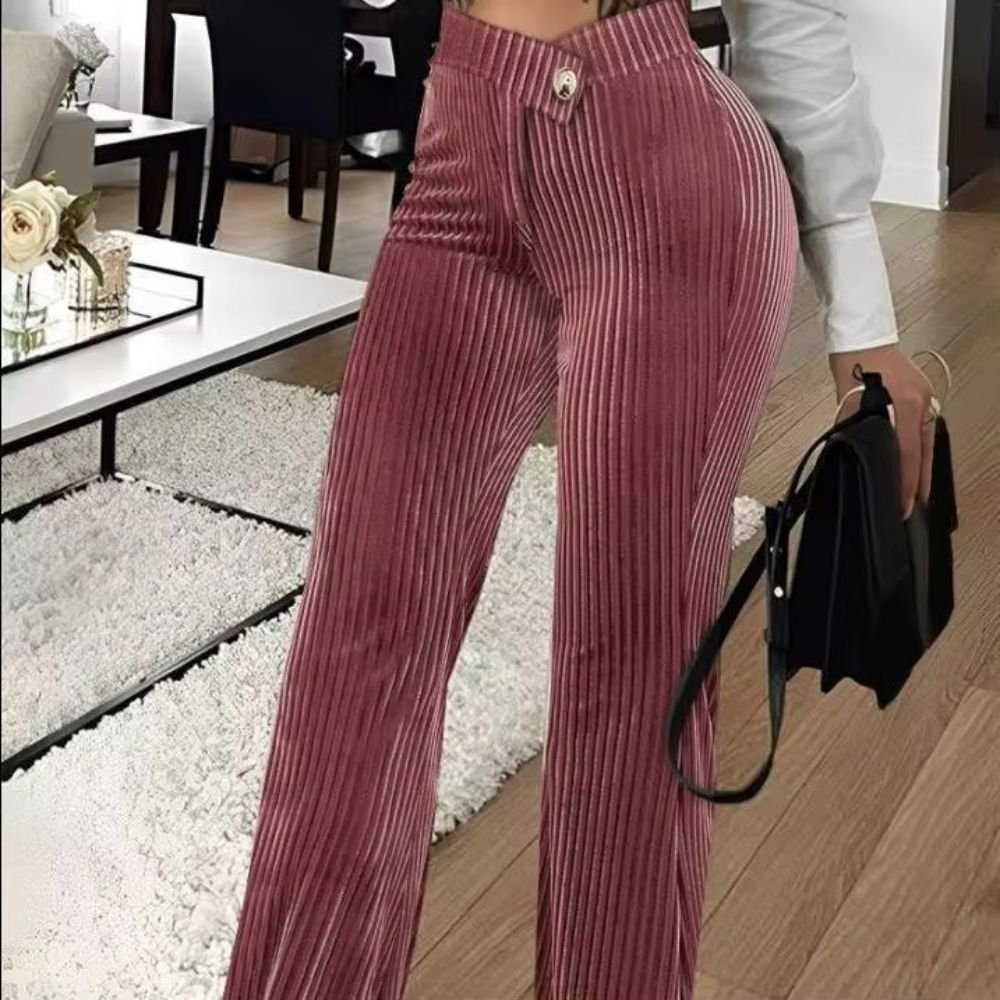 بنطال نسائي بقصّة واسعة  وخامة مخمل مضلّعة تمنح إطلالة فخمة ومميّزة. تصميم بخصر مرتفع مع زر أمامي يبرز القوام بأناقة، ومتوفر بعدة ألوان عصرية تناسب الإطلالات الكاجوال والرسمية
