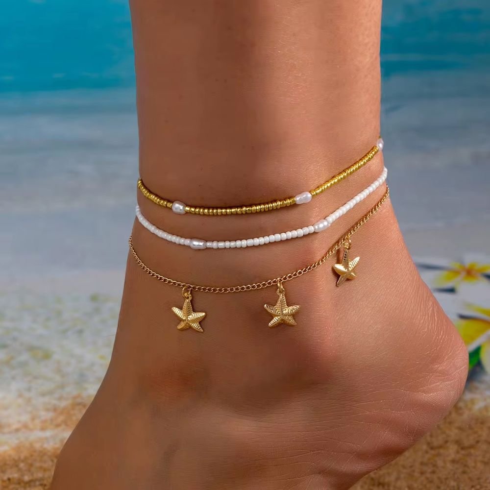 سوار كاحل مكون من ثلاث طبقات : واحدة مزخرفة بحبات لؤلؤية وأخرى من سلاسل ذهبية مزينة بتعليقات نجوم البحر، مما يضيف لمسة من الأناقة والأنوثة