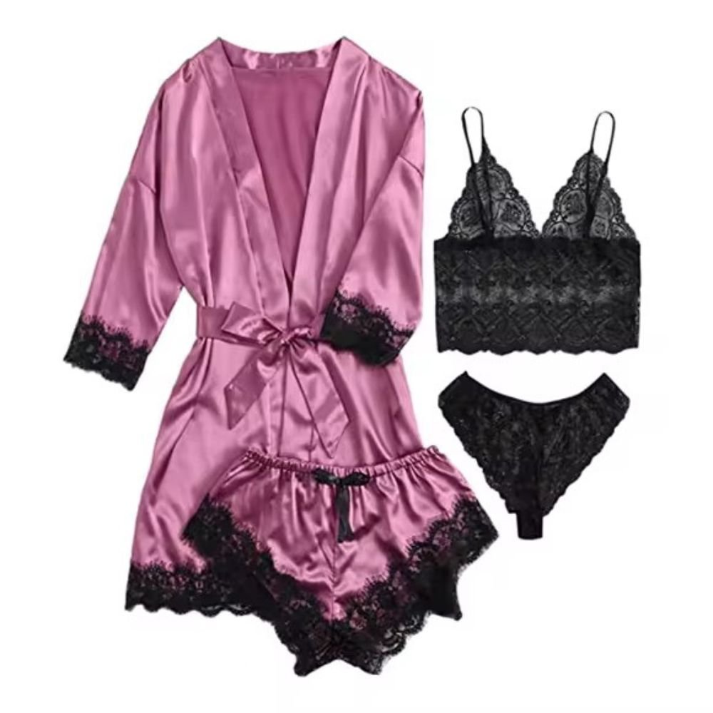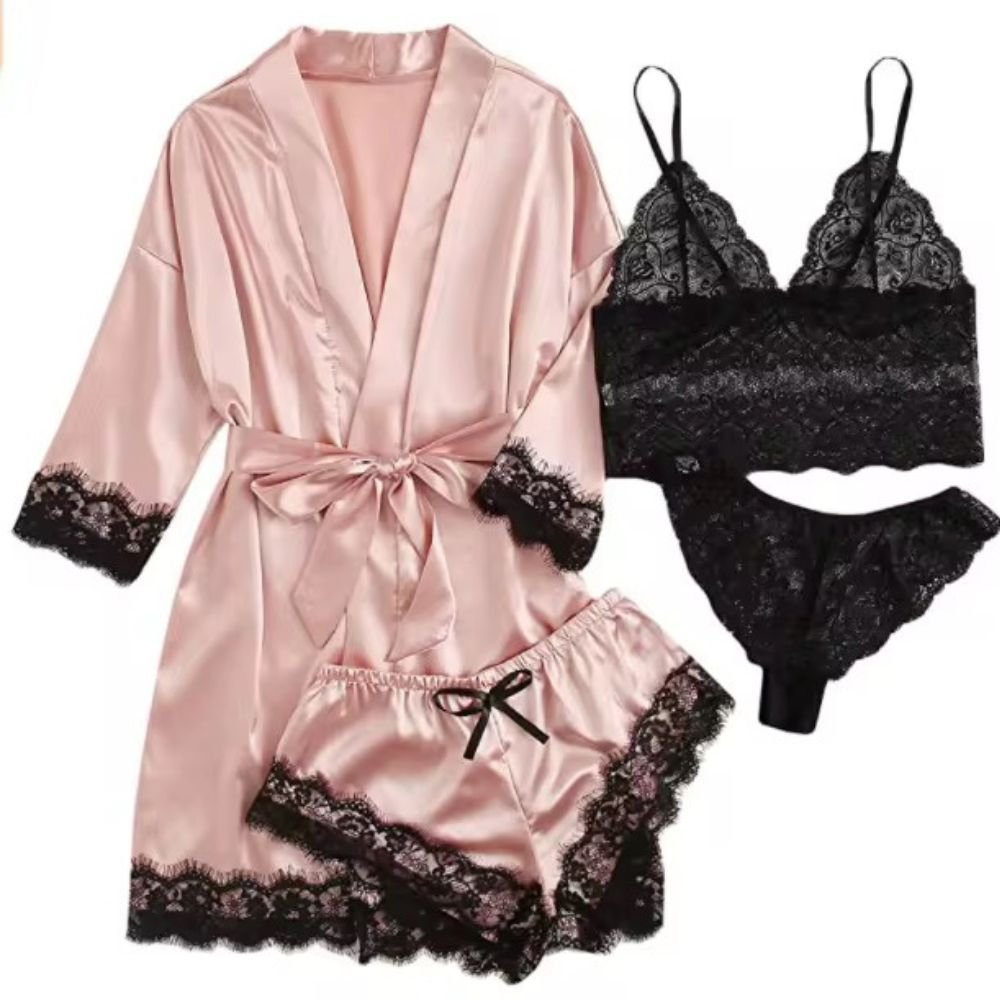 طقم لانجري فاخر مكوّن من 4 قطع : روب ساتان ناعم بحزام أنيق، شورت مريح مزين بدانتيل راقٍ، مع توب وبكيني من الدانتيل الأسود الفخم