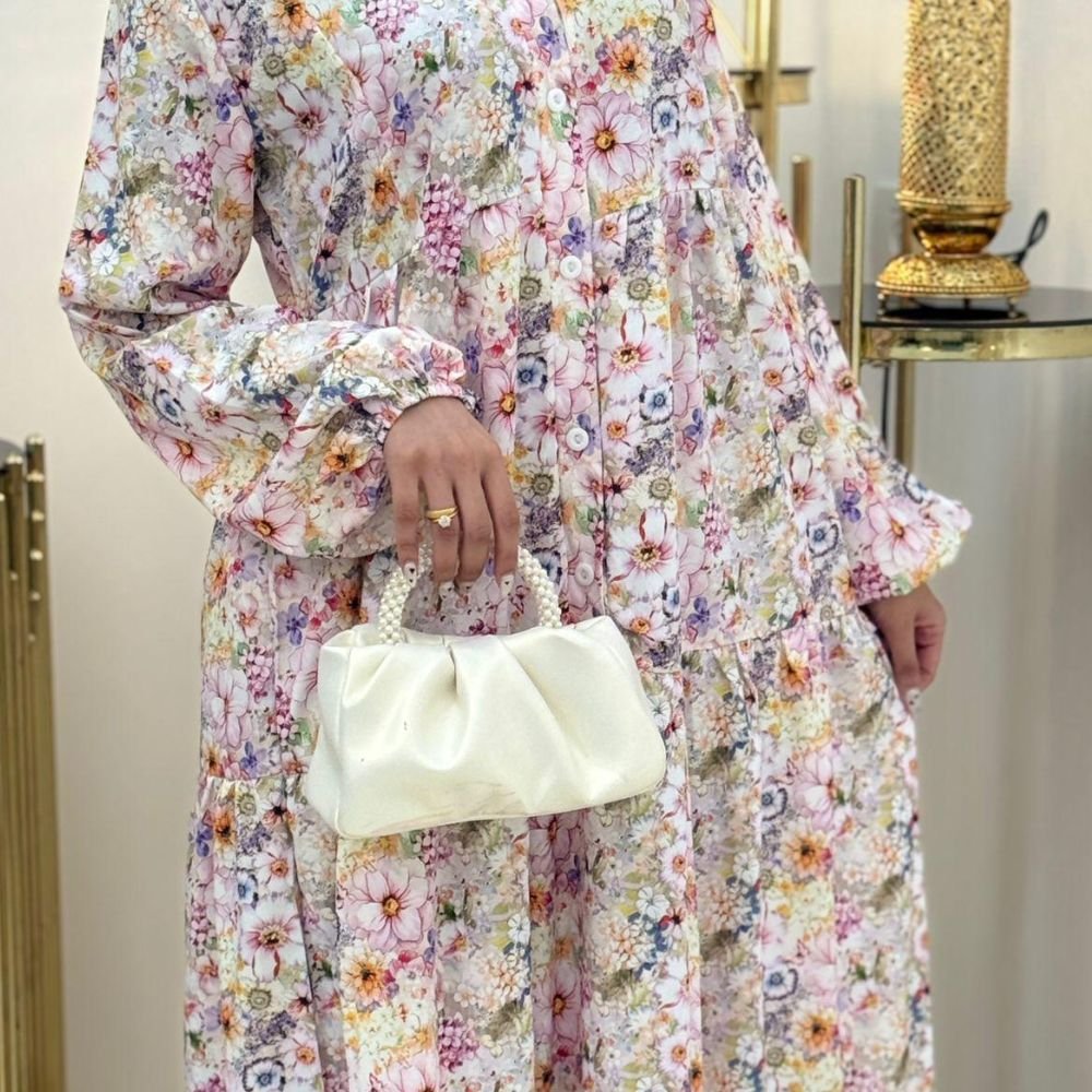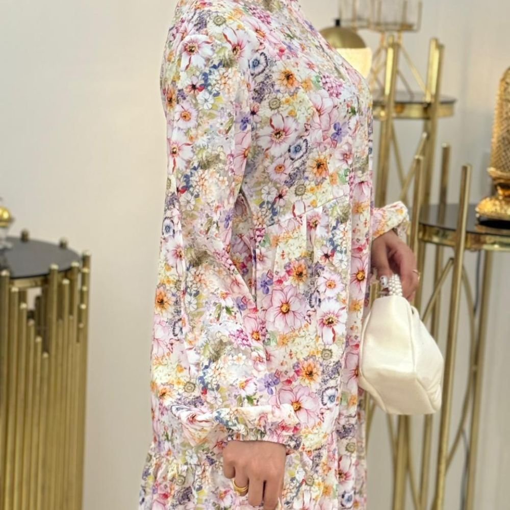 فستان مزخرف بألوان مبهجة يتميز بتصميم عصري ومريح، مصنوع من قماش فيسكوس ناعم. يأتي الفستان بأكمام طويلة وياقة بسيطة مع أزرار على طول الفستان، مما يضفي عليه لمسة من الأناقة. التفاصيل الزهرية المتعددة الألوان على الفستان تمنحه مظهرًا ناعمًا يناسب أجواء الربيع والصيف.
