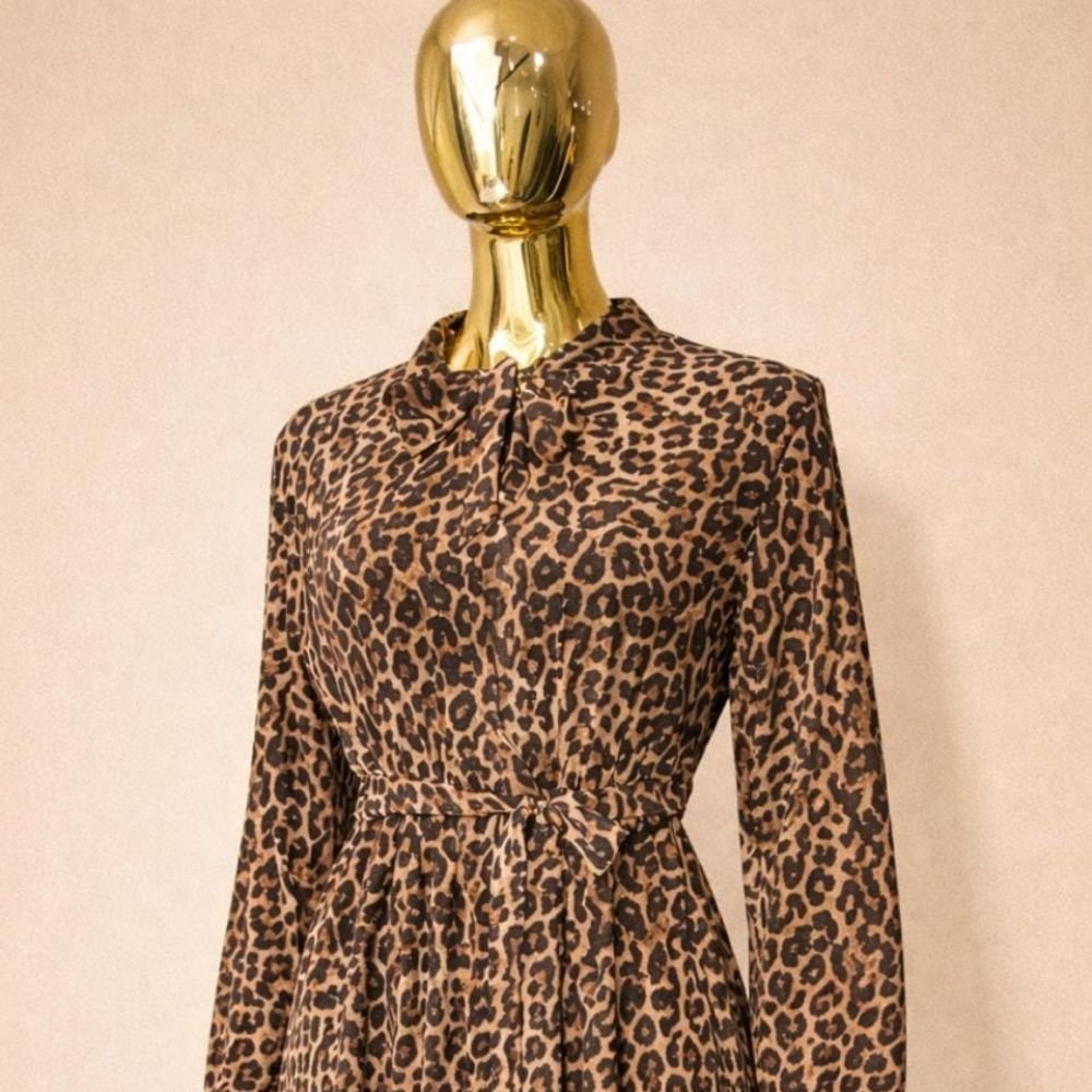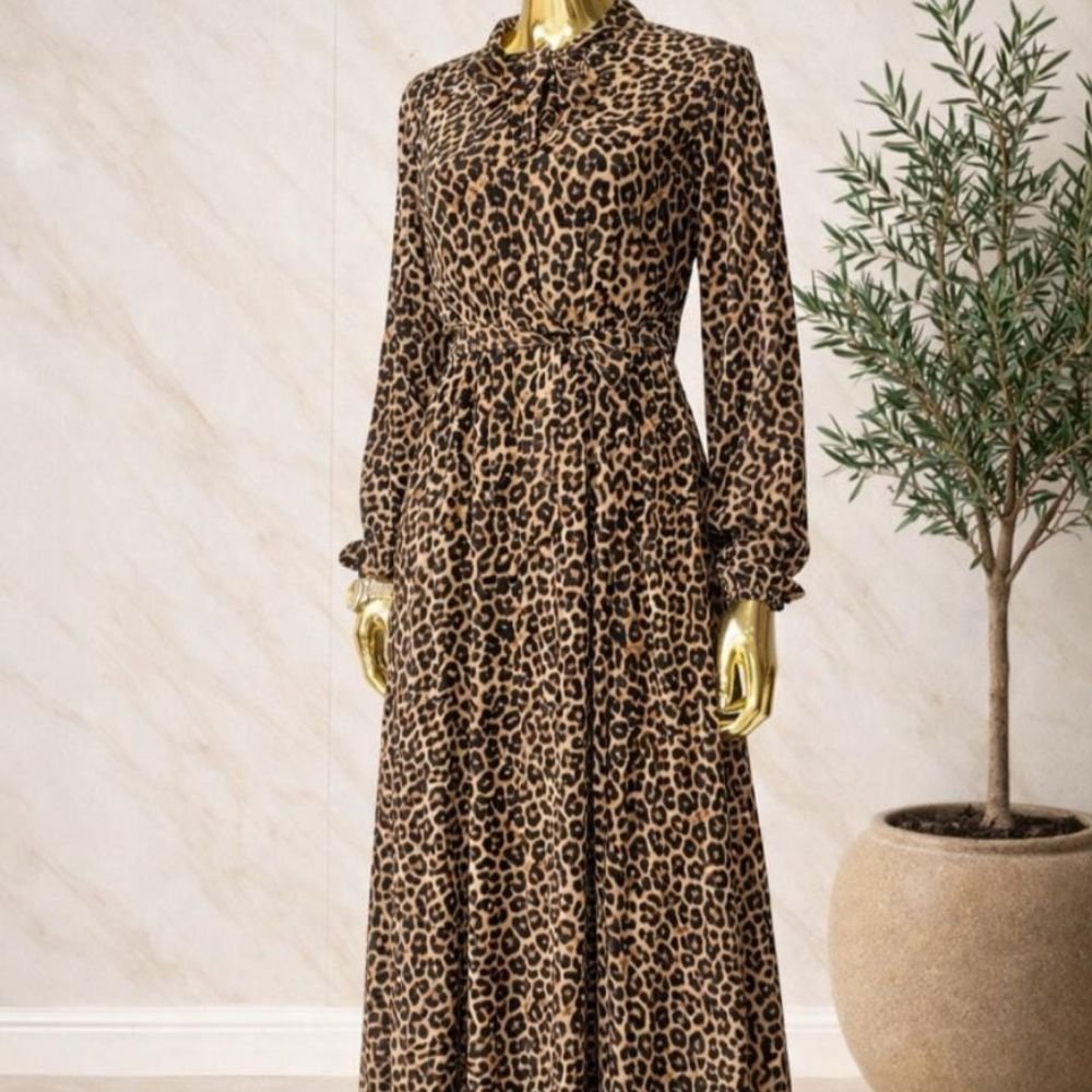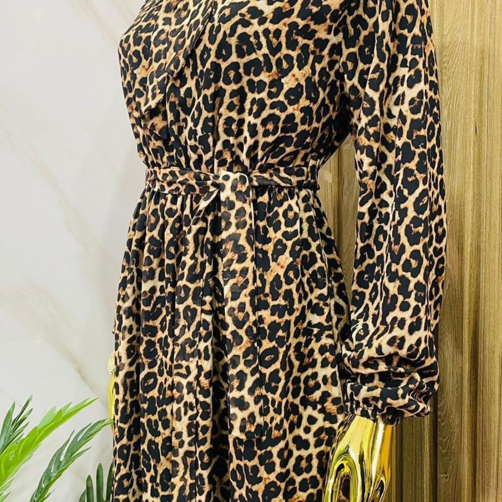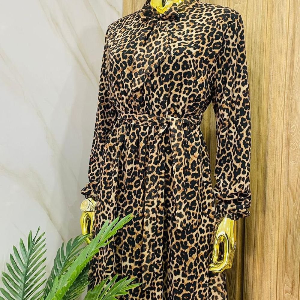فستان نسائي أنيق بنقشة النمر الجريئة يمنحك إطلالة عصرية وجذابة. يتميز بقصة مريحة مع أكمام طويلة وحزام خصر يبرز جمال القوام، مما يجعله خياراً مثالياً للمناسبات والخروجات اليومية بإطلالة أنثوية مميزة