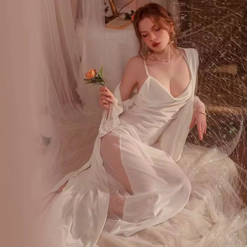 قميص نوم طويل بقصّة انسيابية وناعمة مع ياقة منسدلة تضيف لمسة أنثوية راقية، يرافقه روب طويل شيفون بأكمام مزينة بالدانتيل