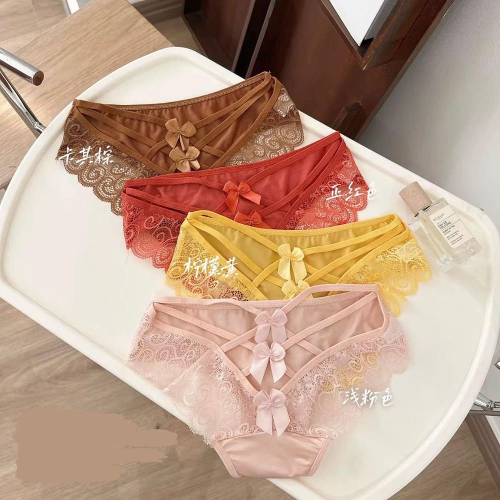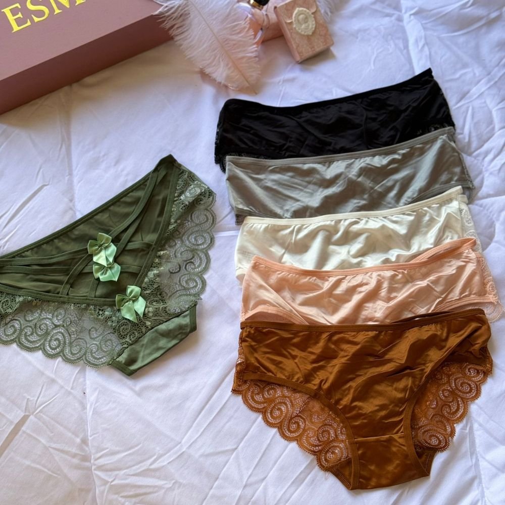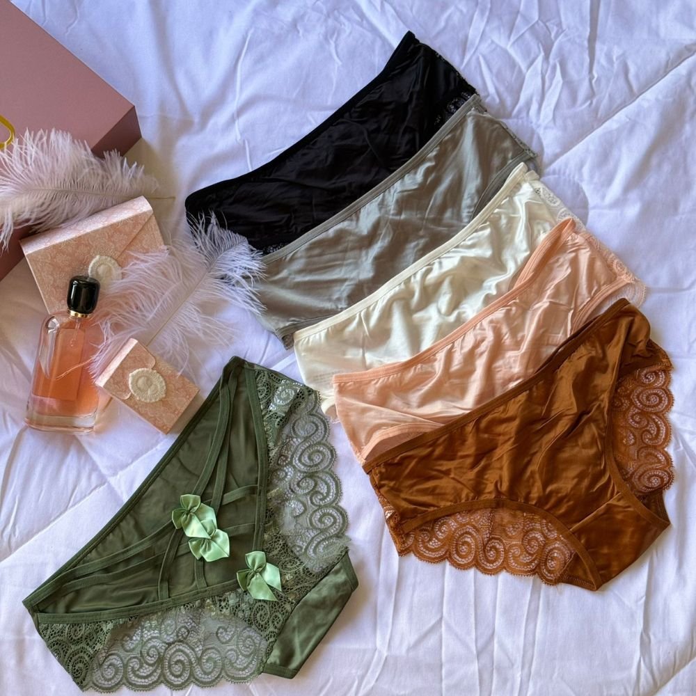 ملابس داخلية أنثوية ملونة بألوان دافئة مثل البني، الأحمر، الأصفر، والوردي. تتميز بتفاصيل دانتيل أنيقة مع شرائط صغيرة تضيف لمسة من الرومانسية والأنوثة. التصميم يتسم بالأناقة والبساطة، مما يجعلها مثالية لإطلالة جذابة ومريحة