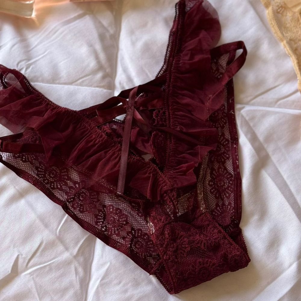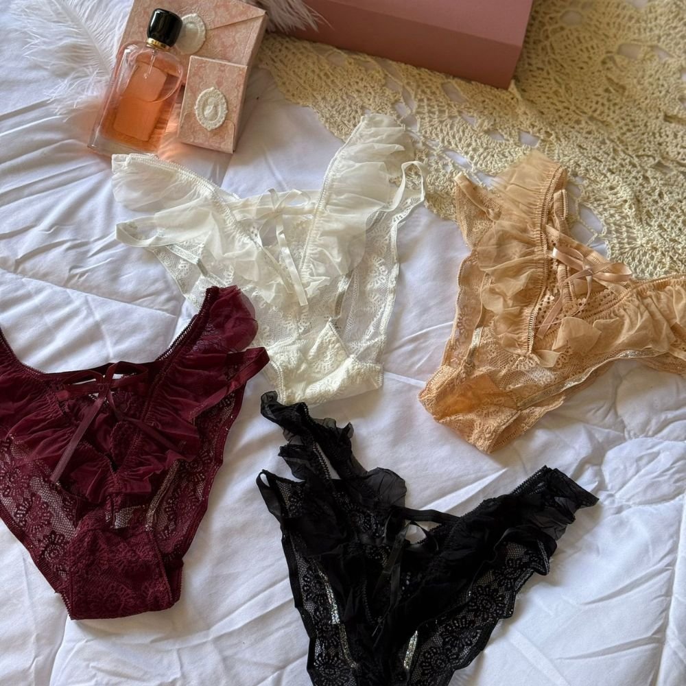 ملابس داخلية أنثوية مكونة من عدة ألوان أنيقة تشمل الأحمر الداكن، الأسود، البيج، والأبيض. تتميز بتفاصيل دانتيل رقيقة وأشرطة تزين كل قطعة، مع تصميمات فاخرة تضيف لمسة من الرومانسية والجمال. القطع مزينة بحواف مزخرفة تضفي عليها جاذبية خاصة، مما يجعلها مثالية لإطلالات مميزة ومريحة