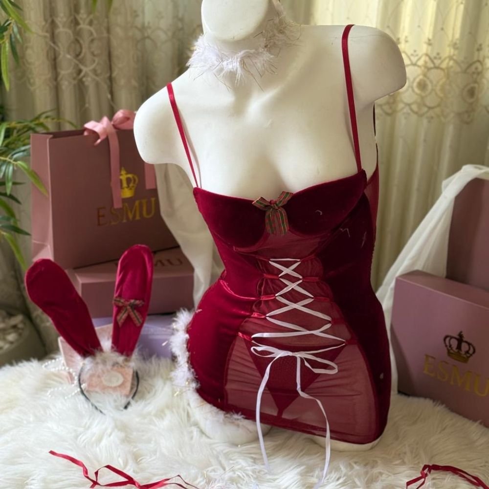 طقم لانجري أحمر مخملي مزين بالفرو الأبيض على الأكتاف والأطراف، مع تفاصيل رباط أمامي على شكل شريط ووردة صغيرة تضيف لمسة من الأناقة. يأتي مع أذني أرنب حمراء وقلادة فاخرة تكمل الإطلالة الجذابة والاحتفالية