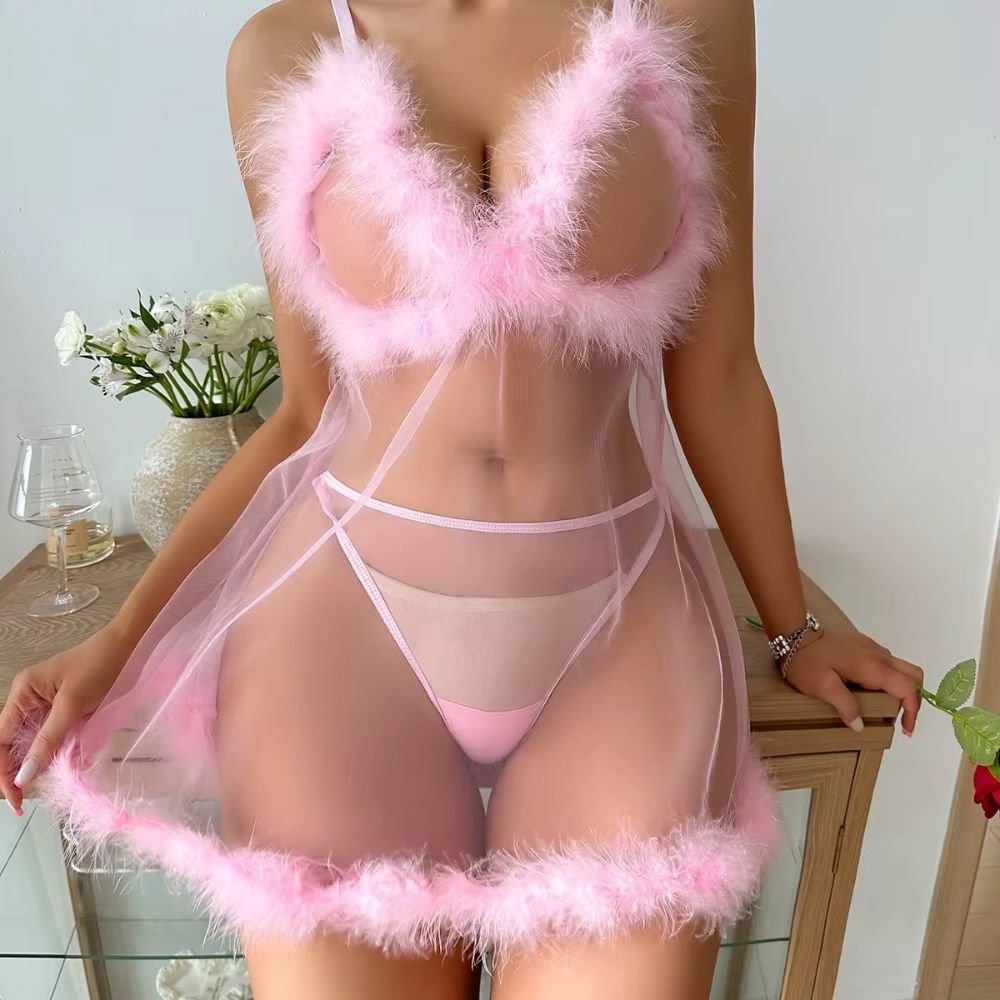 لانجري أنثوي ناعم باللون الوردي، تتميز بحواف مزخرفة بالفرو الناعم حول الصدر وحافة التنورة. التصميم يجمع بين الشفاف والأنيق مع تفاصيل دقيقة تضفي لمسة من الرقة والجمال. هذه القطعة مثالية لإطلالة أنثوية وناعمة