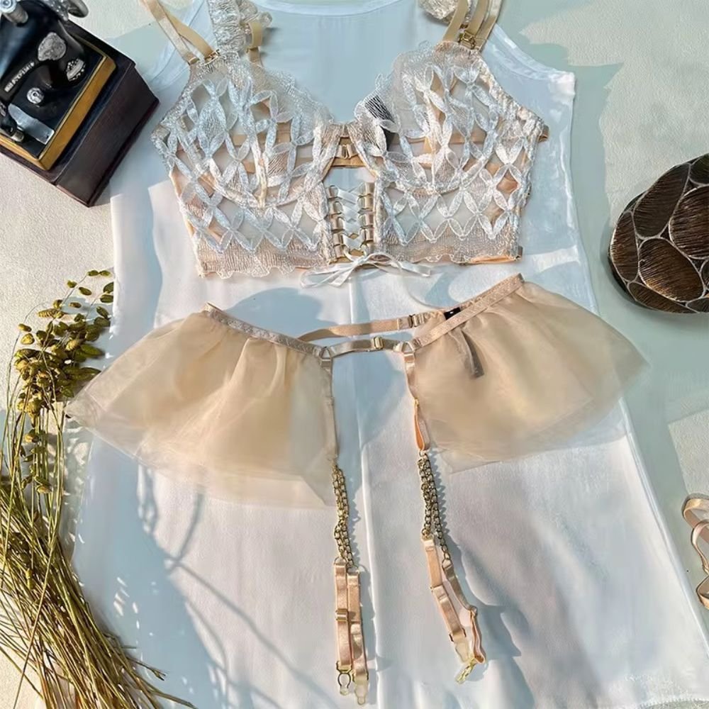 لانجري أنثوي، تتكون من سوتيان مزخرف بتصميم عصري مع تفاصيل ذهبية. يترافق مع تنورة قصيرة من التول الشفاف، مع حمالات لربط الأربطة بطريقة أنيقة. المجموعة تعكس لمسة أنثوية مع لمسات فاخرة، كما تتضمن تفاصيل ذهبية لإضفاء الفخامة