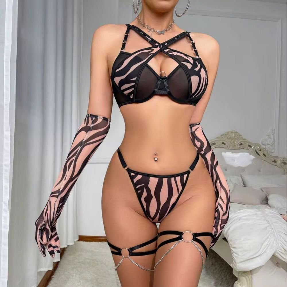 قطعة لانجري نسائية عصرية ومميزة بتصميم طبعة حمار وحشي باللونين الأسود والبيج. تتضمن القطعة صدرية مع تفاصيل متقاطعة على الأكتاف، بالإضافة إلى سروال داخلي وحزام مصنوع من الحبال الجلدية. كما تضم أيضًا أساور ذراع طويلة تضيف لمسة مميزة للأناقة