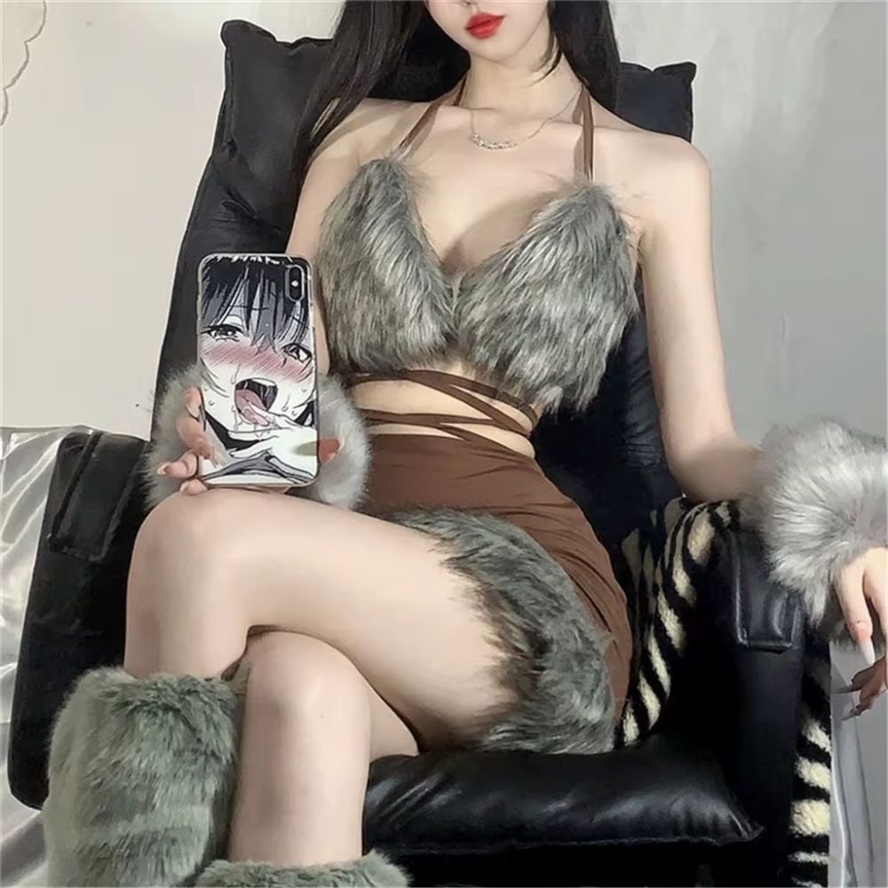 طقم لانجري أنثوي مزين بالفرو الرمادي الناعم مع تصميم شرائط عند الصدر والخصر. يشمل التنورة القصيرة مع تفاصيل من الفرو وأساور أنيقة حول الأيدي والأقدام لإضفاء لمسة من الجاذبية والأنوثة