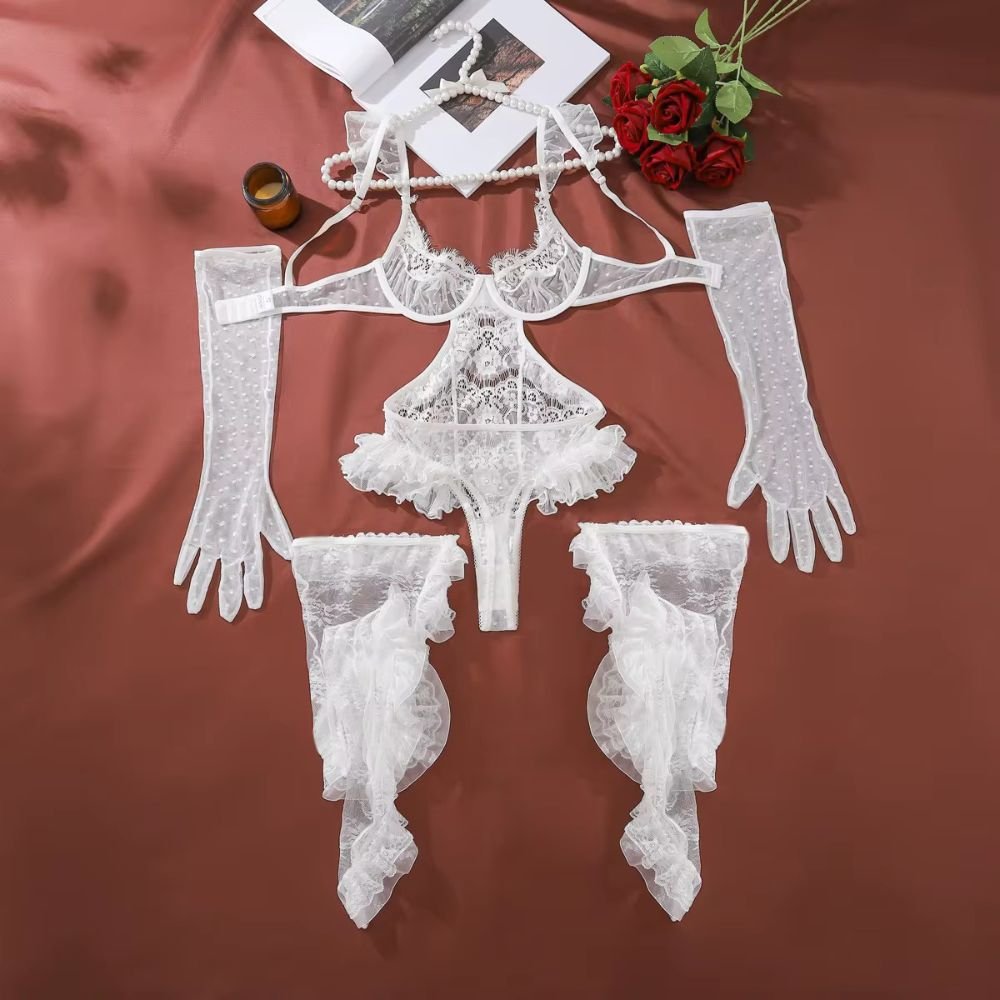 قطعة لانجري أنثوية رائعة بتصميم من الدانتيل الأبيض، مع تفاصيل دقيقة وملمس ناعم يضيف لمسة من الفخامة. تتميز القطعة بحزام رفيع يربط عند الخصر مع فتحة أمامية جذابة تبرز الأنوثة، إضافة إلى الأكمام الشفافة الطويلة التي تمنح إطلالة أنيقة وراقية.