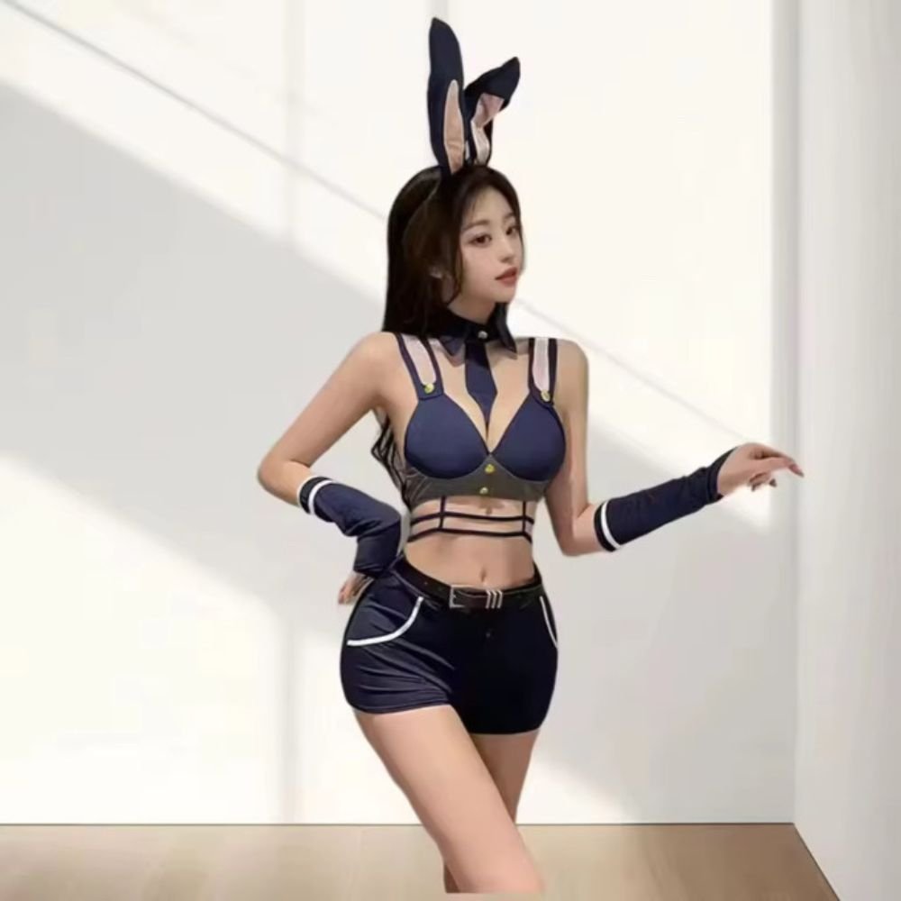 طقم لانجري مميز باللون الأزرق مع أذني قطة لطيفتين، يتضمن تصميم جذاب مع شرائط وأربطة على الصدر والخصر. التنورة القصيرة والأساور تضيف لمسة أنثوية مرحة وأنيقة